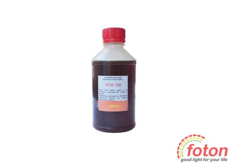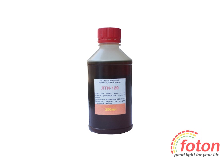 Флюс ЛТІ-120 є безпечним для паяння радіокомпонентів. Поставляється у флаконі об'ємом 250 мл.