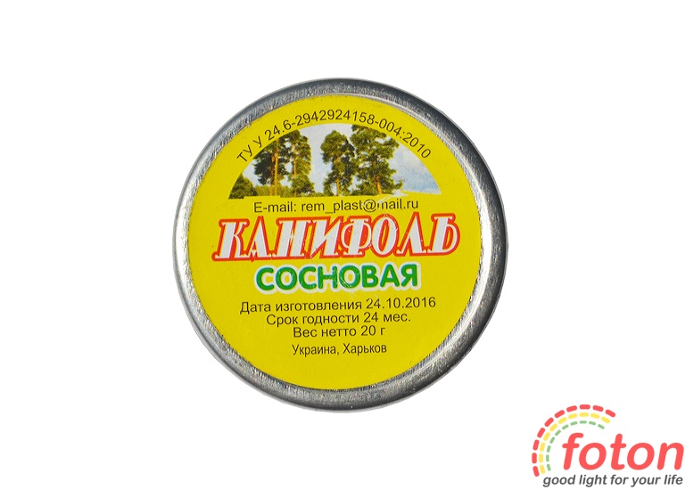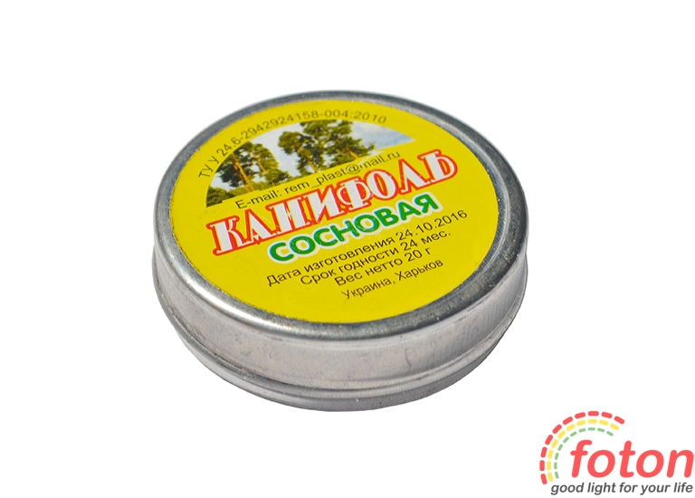 Каніфоль соснова поставляється у металевій баночці масою 20 грам. Застосовується при паянні як флюс, також добре очищає поверхню для паяння. Крім цього, каніфоль використовується у виробництві синтетичного каучуку, целюлозно-паперової, шинної, гумової, лакофарбової промисловості для отримання модифікованих продуктів: елканів, ефірів на основі багатоатомних спиртів, для модифікації природних і синтетичних смол.