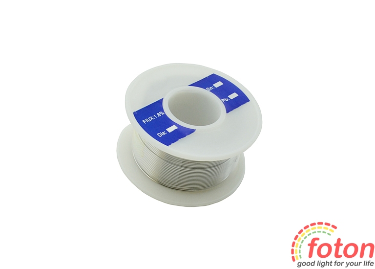 Припій у котушці. Діаметр дроту 0,6 мм. Вага 50 г. Температура плавлення 185-230 ° C.