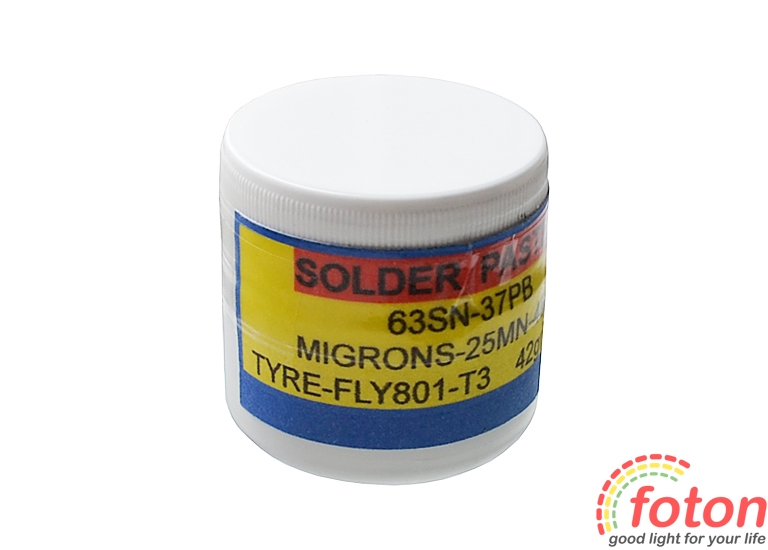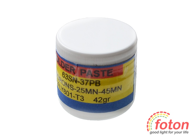 Паяльна паста складається з 63% олова та 37% свинцю. Розмір часток припою від 25 до 45 мкм. Постачається у пластиковій баночці масою 42 гр.