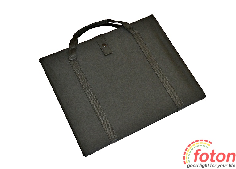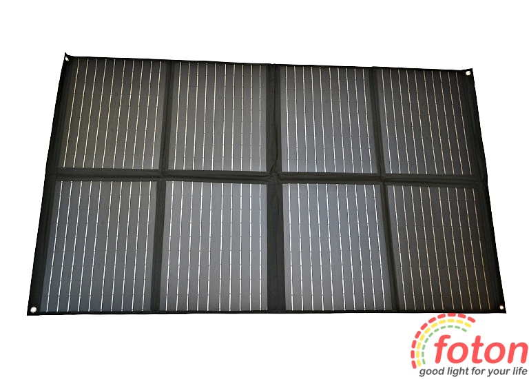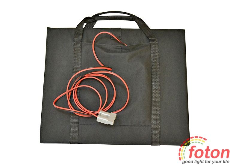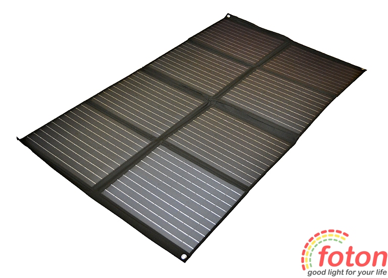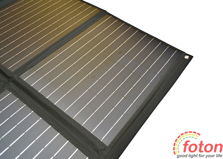 Портативна сонячна панель виконана в чохлі чорного кольору. У складеному стані має вигляд невеликої сумки.Комплектація сонячної батареї має різні перехідники для заряду пристроїв або акумуляторів. літій-іонні або літій-полімерні акумулятори у поєднанні з контролером заряду
