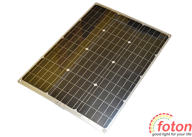 Портативна напівгнучка сонячна панель потужністю 50Вт має два вихідні роз'єм USB та роз'єм Power jack 5,5mm (Мама). USB роз'єм має вихідну напругу 5В, струм 2 А. Роз'єм Power jack 5,5mm (Мама) - вихідна напруга 12-18 вольт. Панель має алюмінієву основу, на якій розташовані ламіновані клітини.