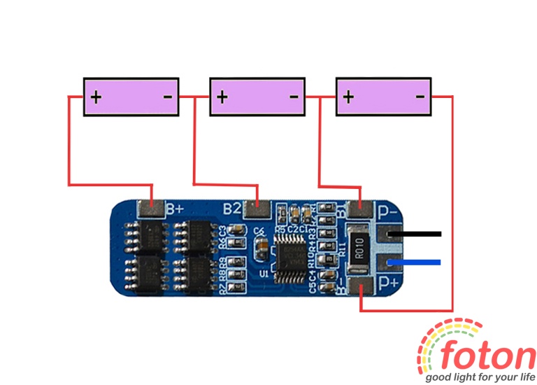 Підключення акумуляторів має строгу послідовність, яку необхідно дотримуватися. На платі розміщені контактні майданчики, призначені для підключення за допомогою паяння. Також на контактах встановлені металеві пластини для здійснення точкового зварювання.