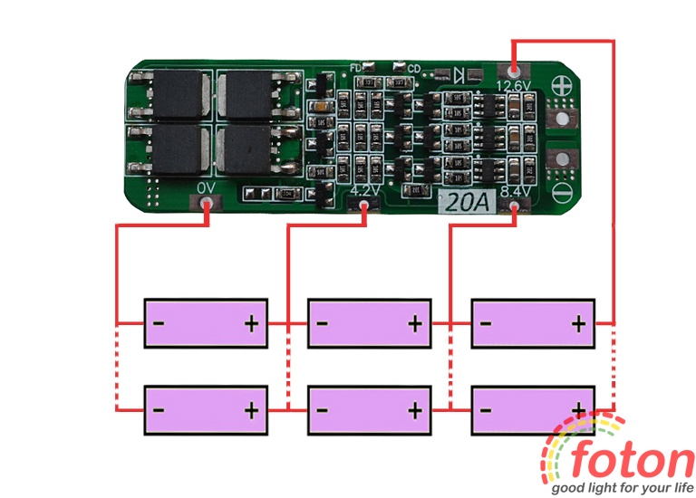 Підключення акумуляторів має строгу послідовність, яку необхідно дотримуватися. На платі розміщені контактні майданчики, призначені для підключення за допомогою паяння. Також на контактах встановлені металеві пластини для здійснення точкового зварювання.
