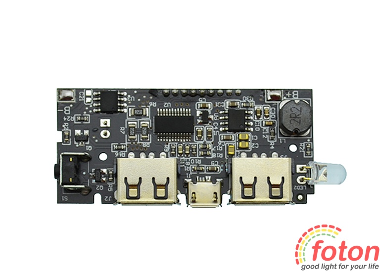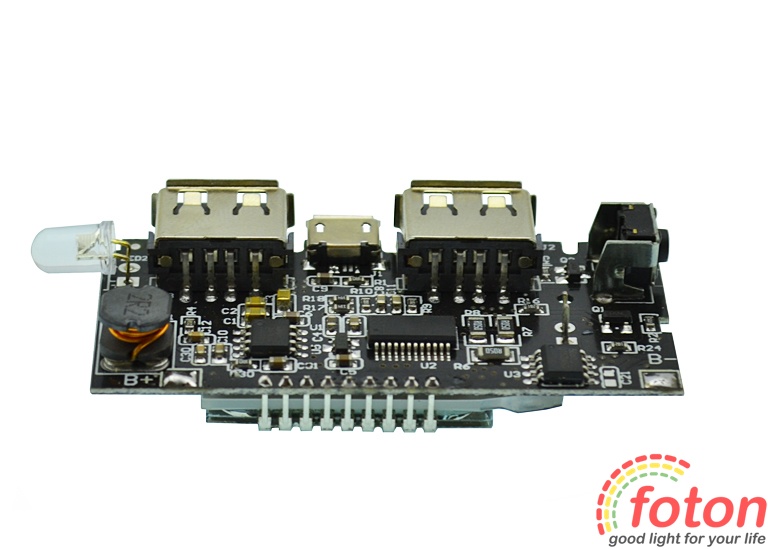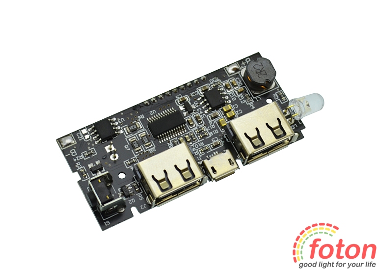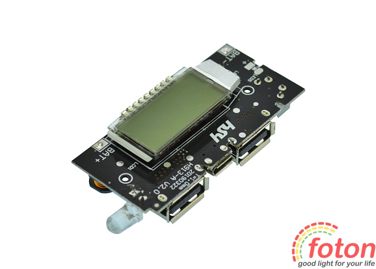 Спеціалізована плата Power Bank Dual USB 2,1А with LCD display призначена для встановлення в корпус портативного зарядного пристрою. Ця плата має LCD дисплей, на який виводиться інформація про статус заряду. Оснащена двома роз'ємами USB з вихідним струмом 2,1А та 1А.
