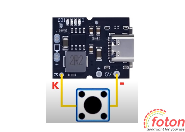 За бажанням, до цієї плати Power Bank можна встановити кнопку, щоб увімкнути або вимкнути зарядку. На платі є контакт К – сюди припаюємо позитивний контакт кнопки, а негативний контакт припаюємо на мінус, де пишуть 5V. Одноразове натискання кнопки здійснить увімкнення пристрою, тобто. включатися індикатори і вихід піде 5В. Утримування кнопки (протягом 5 секунд) вимкне пристрій. Подвійне натискання вимкне індикатори та вихід із пристрою.