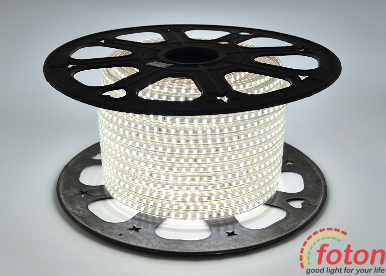 Світлодіодна стрічка на світлодіодах SMD 2835 у кількості 120 штук на метр, slim серія, має захист від вологи та пилу. Робоча напруга становить 220В. Колір свічення: білий холодний (6000К).