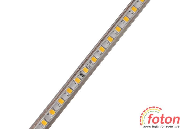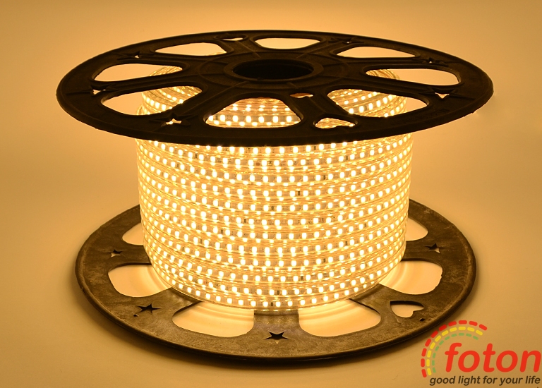 Світлодіодна стрічка на світлодіодах SMD 2835 у кількості 120 штук на метр, slim серія, має захист від вологи та пилу. Робоча напруга становить 220В. Колір свічення: білий теплий (3000К).