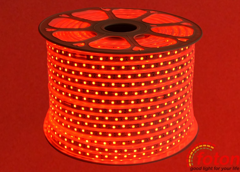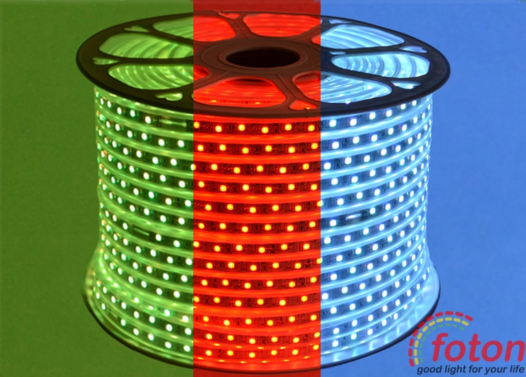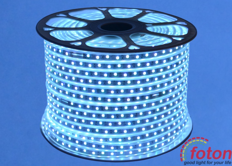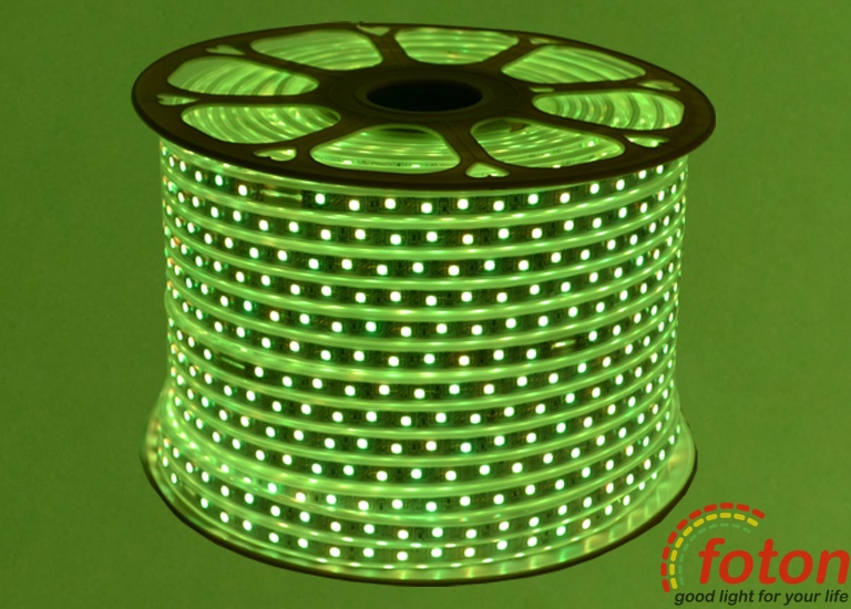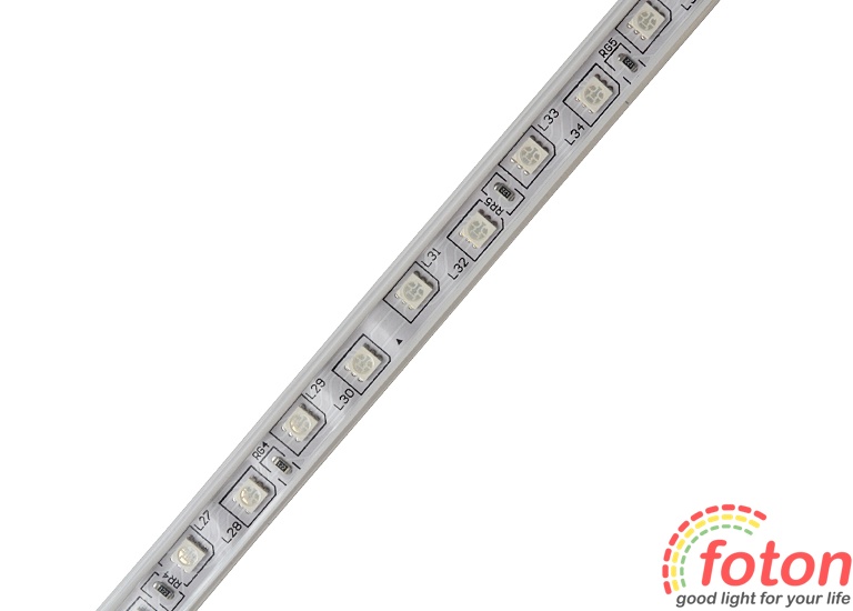 Світлодіодна стрічка на світлодіодах SMD 5050 у кількості 60 штук на метр, має захист від вологи та пилу класом IP68. Робоча напруга становить 220В. Колір світіння: RGB