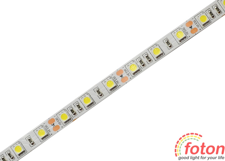 Світлодіодна стрічка на світлодіодах SMD 5050, 60 світлодіодів на метр, біла підкладка, преміум серія, клас захисту IP20, який не передбачає захисту від вологи, тому дана стрічка підходить тільки для встановлення всередині приміщень з низькою вологістю. Світлодіодна стрічка 5050 найчастіше застосовується як основне освітлення.