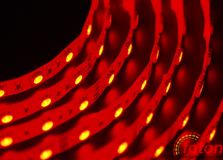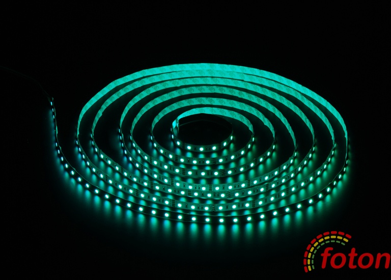 Світлодіодна стрічка RGB на світлодіодах SMD 5050, 60 світлодіодів на метр, біла підкладка, економ серія, клас захисту IP20, який не передбачає захисту від вологи, тому дана стрічка підходить тільки для встановлення всередині приміщень з низькою вологістю. Світлодіодна стрічка RGB найчастіше застосовується як повнокольорове декоративне підсвічування.