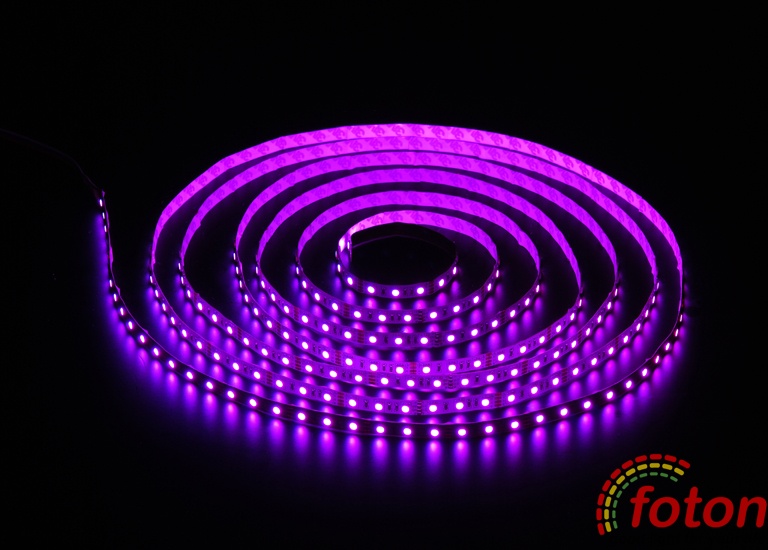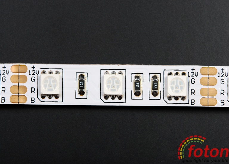 Світлодіодна стрічка RGB на світлодіодах SMD 5050, 60 світлодіодів на метр, біла підкладка, преміум серія, клас захисту IP20, який не передбачає захисту від вологи, тому дана стрічка підходить тільки для встановлення всередині приміщень з низькою вологістю. Світлодіодна стрічка RGB найчастіше застосовується як повнокольорове декоративне підсвічування.