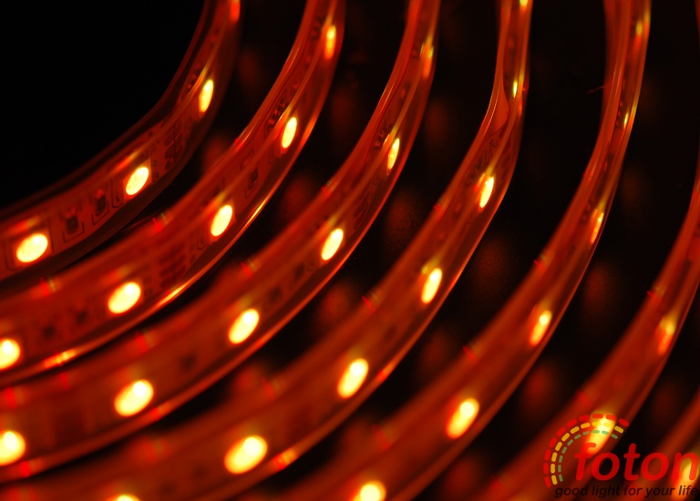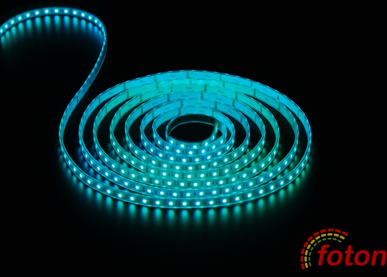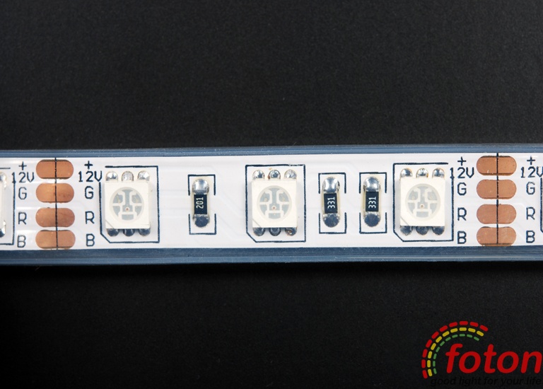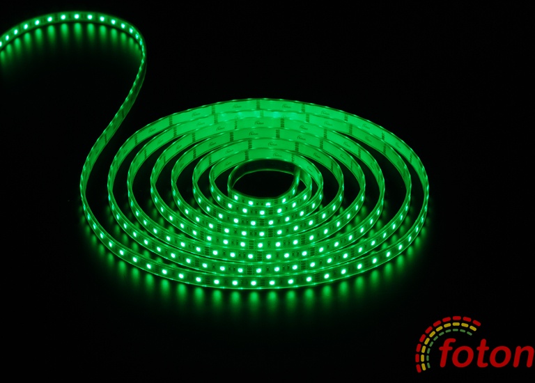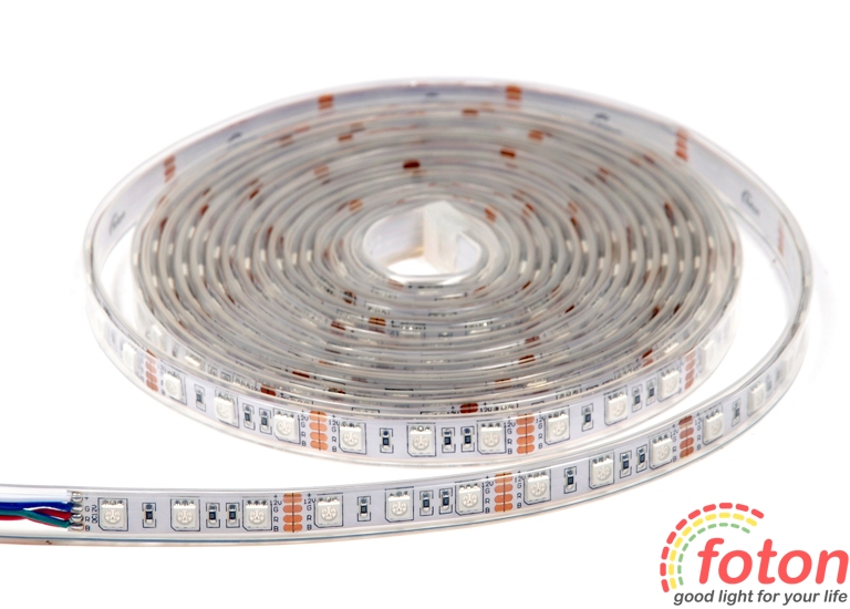Світлодіодна стрічка RGB на світлодіодах SMD 5050, 60 світлодіодів на метр, біла підкладка, преміум серія, клас захисту IP68, який передбачає повний захист від вологи, тому дана стрічка підходить для установки під водою, всередині та зовні приміщень з підвищеною вологістю та прямим. Таку ж стрічку можна використовувати для підсвічування коліс автомобілів. Світлодіодна стрічка RGB найчастіше застосовується як повнокольорове декоративне підсвічування.