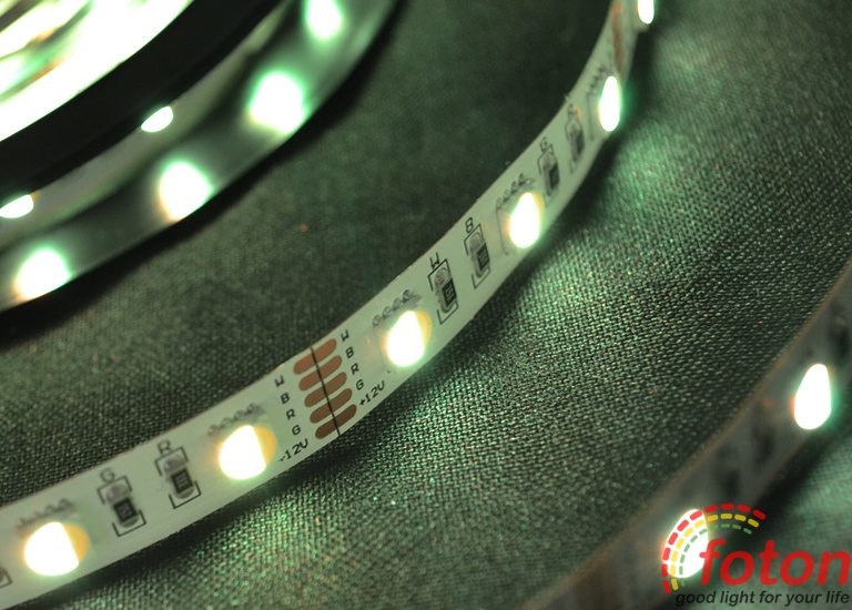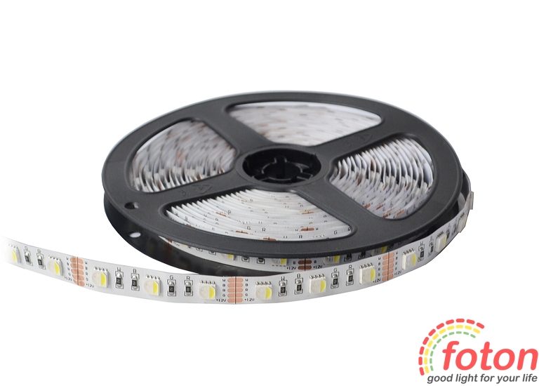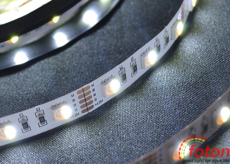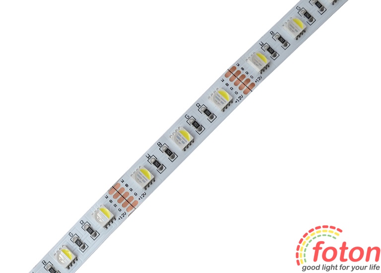 Світлодіодна стрічка RGB+W на світлодіодах SMD 5050, 60 світлодіодів на метр, біла підкладка, економ серія, клас захисту IP20. Ця стрічка підходить для встановлення в приміщеннях або кімнатах, в яких відсутня підвищена волога. Світлодіодна стрічка RGBW найчастіше застосовується як повнокольорове декоративне підсвічування з окремим яскравим білим свіченням.