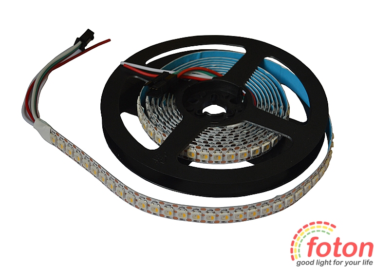 Адресна світлодіодна стрічка RGB на світлодіодах SMD 5050, 144 світлодіодів на метр, біла підкладка, преміум серія, клас захисту IP20, який не передбачає захисту від вологи, тому дана стрічка підходить тільки для встановлення всередині приміщень з низькою вологістю. Стрічка має поодинокі світлодіоди SMD 5050 RGB, які оснащені керуючою мікросхемою SK6812. Світлодіоди мають послідовний ланцюжок з'єднання з трьома контактними доріжками (живлення, передача даних та загальний). Підключення стрічки здійснюється лише з одного боку (напрямок вказано біля кожного світлодіода). За допомогою цієї led стрічки можна виконати різнокольорове кероване підсвічування, а також можна включити окремо білий колір свічення. Світлодіодна стрічка RGB найчастіше застосовується як програмоване повнокольорове декоративне підсвічування.