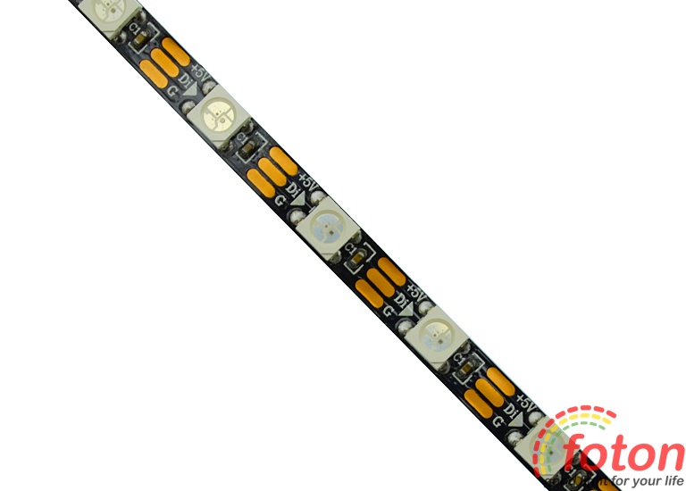 Адресна світлодіодна стрічка RGB на світлодіодах SMD 5050, 60 світлодіодів на метр, чорна та вузька підкладка, економ серія, клас захисту IP20, який не передбачає захисту від вологи, тому дана стрічка підходить тільки для встановлення всередині приміщень з низькою вологістю. Стрічка має поодинокі світлодіоди SMD 5050 RGB, які оснащені керуючою мікросхемою WS2812. Світлодіоди мають послідовний ланцюжок з'єднання з трьома контактними доріжками (живлення, передача даних та загальний). Підключення стрічки здійснюється лише з одного боку (напрямок вказано біля кожного світлодіода). За допомогою даної led стрічки можна виконати різнокольорове кероване підсвічування. Світлодіодна стрічка RGB найчастіше застосовується як програмоване повнокольорове декоративне підсвічування.