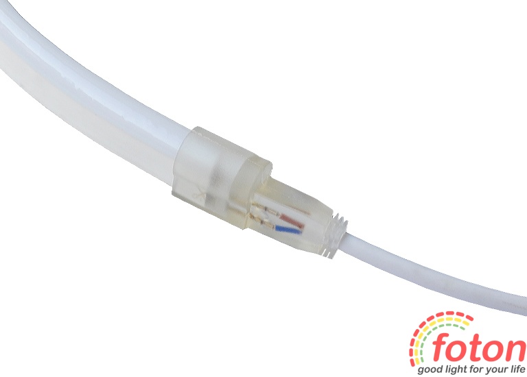 Сполучний кабель для світлодіодного неону 220В забезпечує надійний монтаж та подачу напруги. Даного кабелю недостатньо для того, щоб підключити його до led neon 220v, при цьому позбавиться мерехтіння. Для цього існує кабель живлення з випрямлячем. Необхідність даного пристосування полягає у зручності з'єднання неонової вивіски з безліччю елементів, що світяться. При підключенні необхідно спочатку підключити конектор вилочку, потім з'єднати з кабелем живлення.