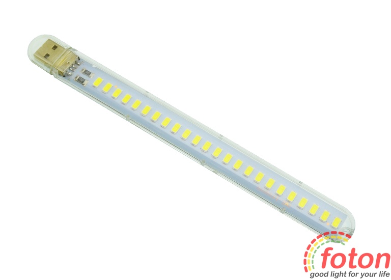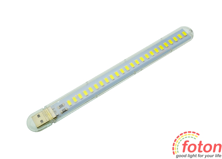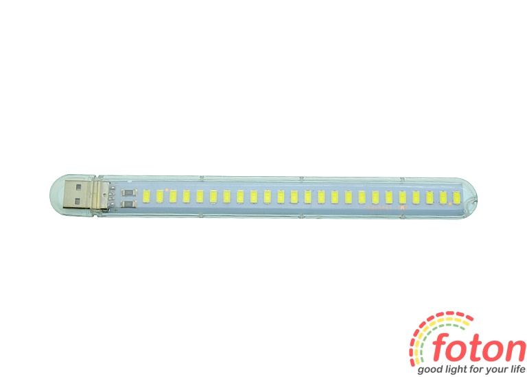 Портативна USB лампочка для підсвічування клавіатури, читання книг та кемпінгу. Має прозорий пластиковий корпус та захисну заглушку для USB роз'єму. Джерелом світіння є світлодіодний модуль потужністю 12 Вт, який укомплектований світлодіодами SMD 5730 у кількості 24-х штук. Підключення лампи виконується через роз'єм USB. Харчування 5 вольт.