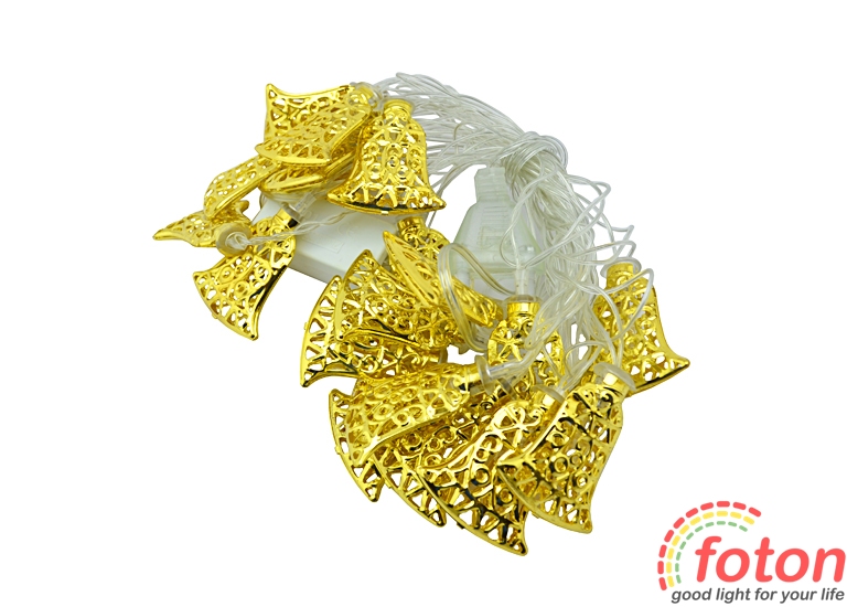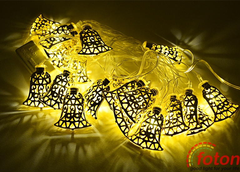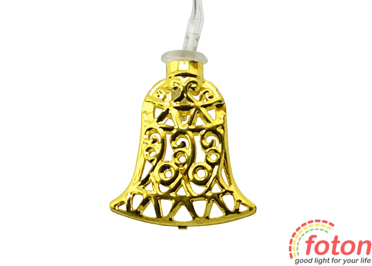 Світлодіодна гірлянда нитка, "Дзвіночки", представлена ??у вигляді напрямної нитки зі світлодіодними джерелами свічення. Світло біле тепле. Декоративне оснащення у вигляді дзвіночків золотистого кольору надає витонченості, що є родзинкою цієї гірлянди. Матеріал дзвіночків - забарвлений метал.