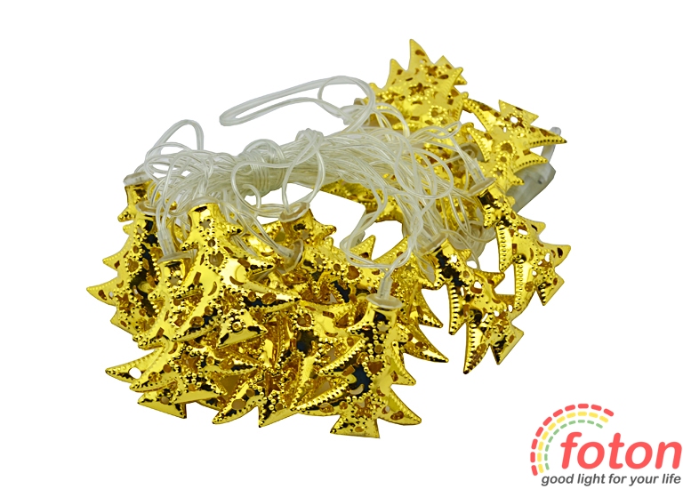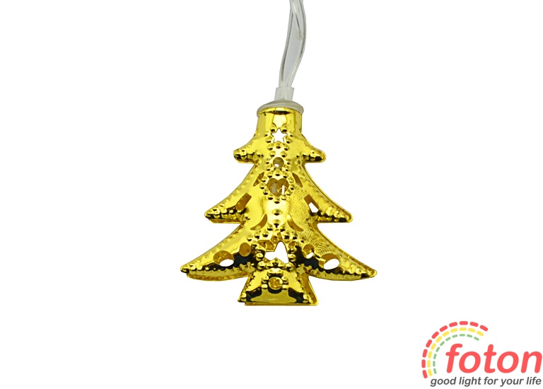 Світлодіодна гірлянда нитка, "Новорічні Ялинки", представлена ??у вигляді напрямної нитки зі світлодіодними джерелами свічення. Світло біле тепле. Декоративне оснащення у вигляді ялинок золотистого кольору надає витонченості, що є родзинкою цієї гірлянди. Матеріал ялинок - пофарбований метал.