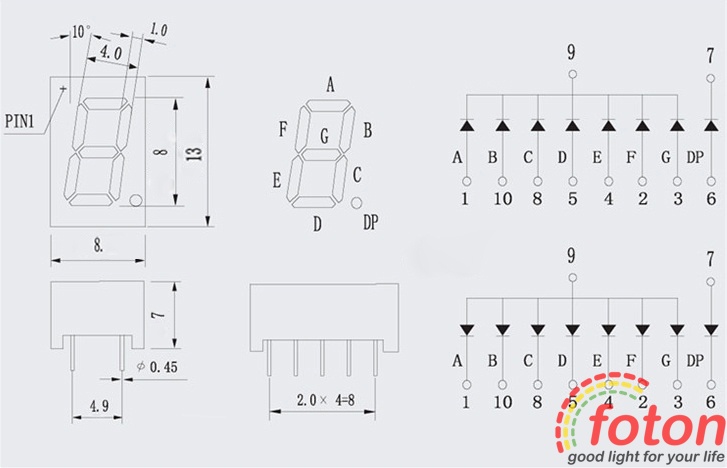 Семісегментний світлодіодний індикатор з точкою, призначений для створення невеликих цифрових табло, може використовуватися в приладах та устаткуванні. Дозволяє відображати одну цифру та точку, світло світлодіода червоне, підкладка чорна.
