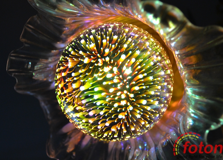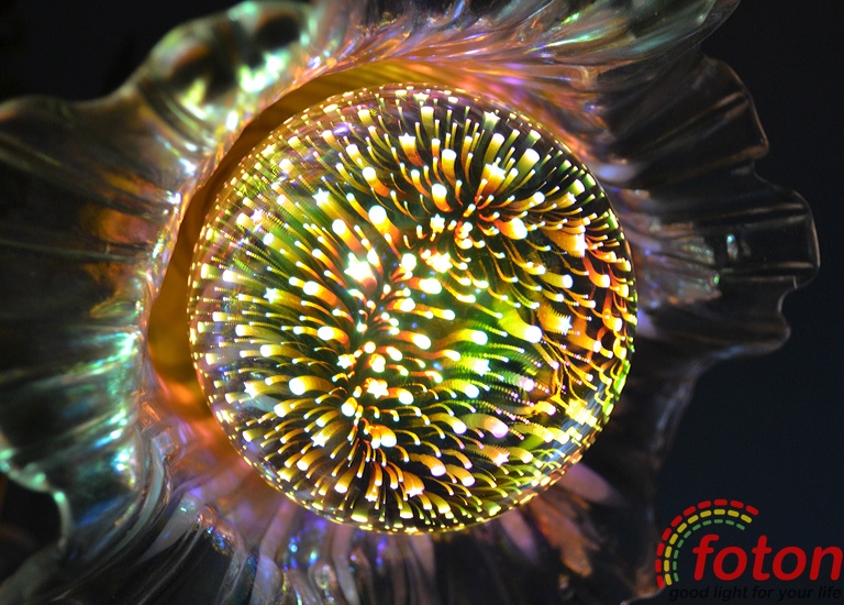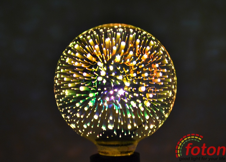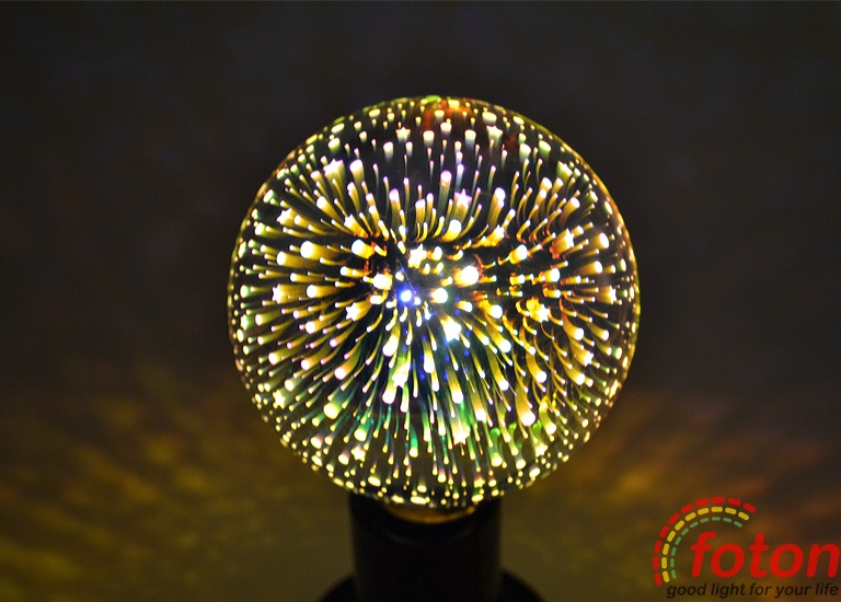 Декоративна світлодіодна лампа 3D, також має назву світлодіодна лампа феєрверк, оскільки ефект проектування світіння чимось схожий на нього. Світлення здійснюється за допомогою світлодіодів SMD2835 у кількості 35шт. Світлодіоди розміщені на алюмінієвому радіаторі, який сприяє відводу тепла від джерел світла та тривалій роботі лампи.