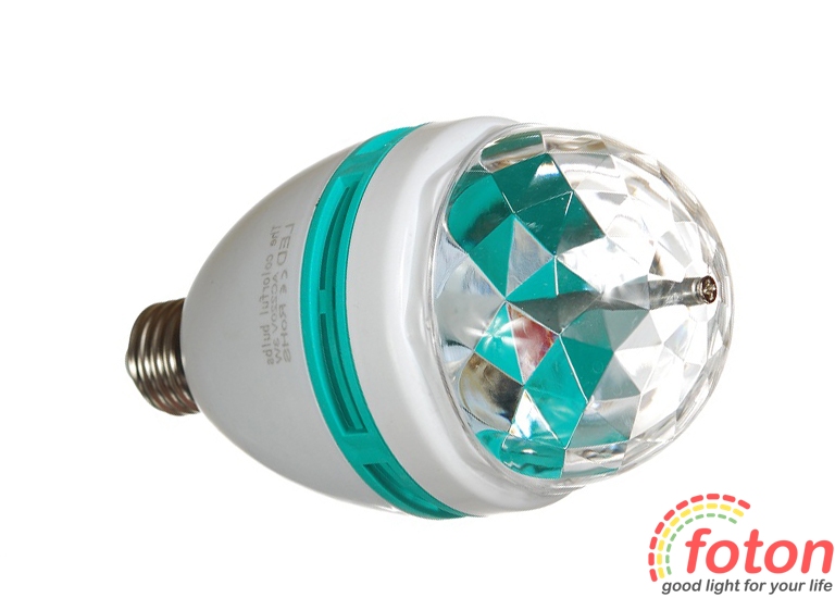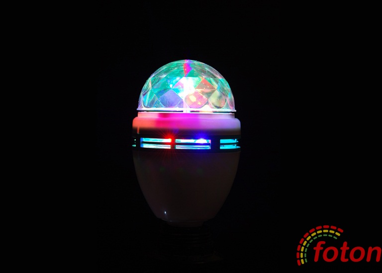 Світлодіодна диско-лампа E27, 220V 3W Rotating RGB, потужність 3Вт, робоча напруга 220В. Вбудований поворотний механізм. Ця модель призначена для організації вечірок, корпоративів, свят.