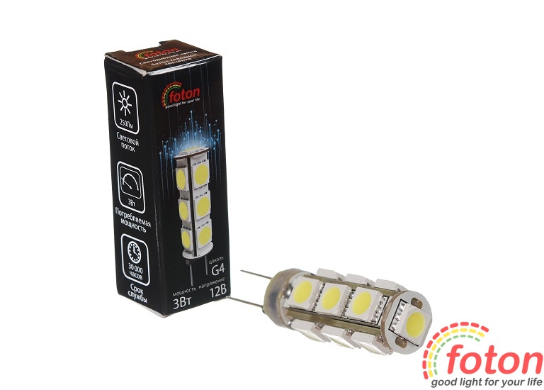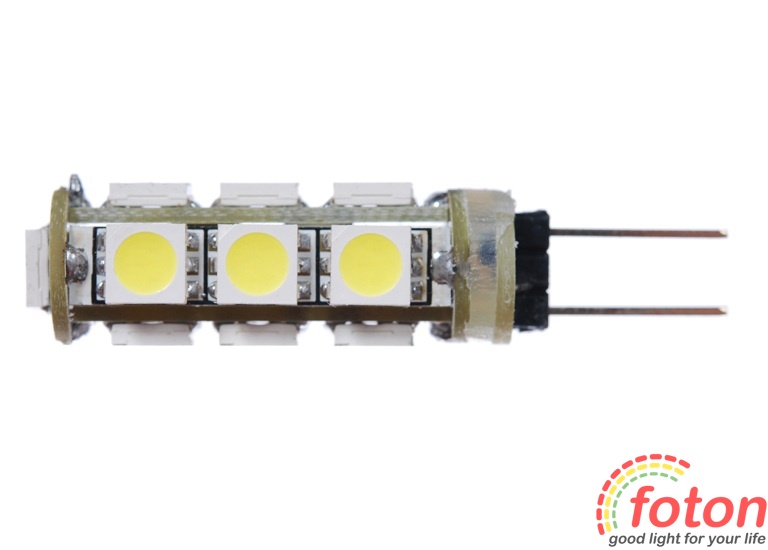 Світлодіодна лампа, цоколь G4, робоча напруга 12В, 13 світлодіодів SMD 5050, розсіяне свічення. Аналог галогенної лампи на 25Вт. Дана модель призначена для заміни галогенних ламп у різних люстрах та світильниках.