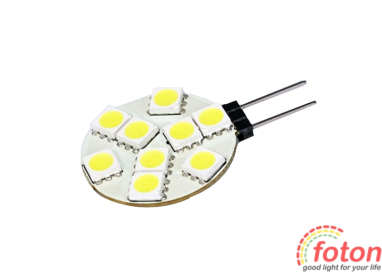 Світлодіодна лампа з цоколем g4, робоча напруга 12В, 9 світлодіодів SMD 5050, розсіяне свічення.Використання SMD світлодіодів як джерело світла забезпечує високий ресурс лампи. Завдяки широкому куту розсіювання, дана модель має рівномірне свічення.Світлодіодні лампи g4 призначені для заміни галогенних ламп з цоколем g4.