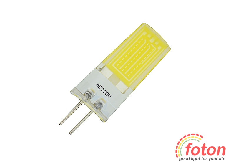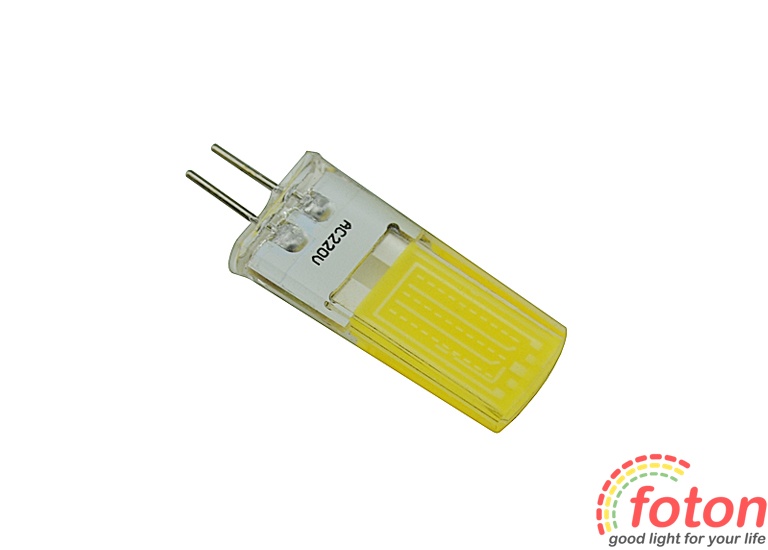 Світлодіодна лампа G4, 220V COB 1909 споживає лише 4 Вт, працює від 220В, і видає 400 Лм світлового потоку, яке дорівнює 40Вт галогенній лампочці. Дана LED лампа має рівномірне свічення.