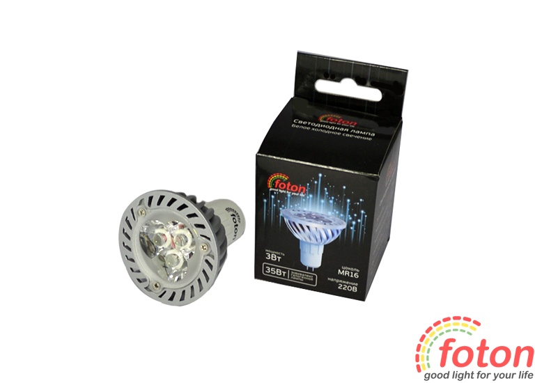 Світлодіодна лампа з цоколем mr16, робоча напруга 220В, 3 світлодіоди по 1 Вт, спрямоване свічення. Аналог галогенної лампи на 35Вт. Ця модель призначена для заміни галогенних ламп у точкових світильниках.