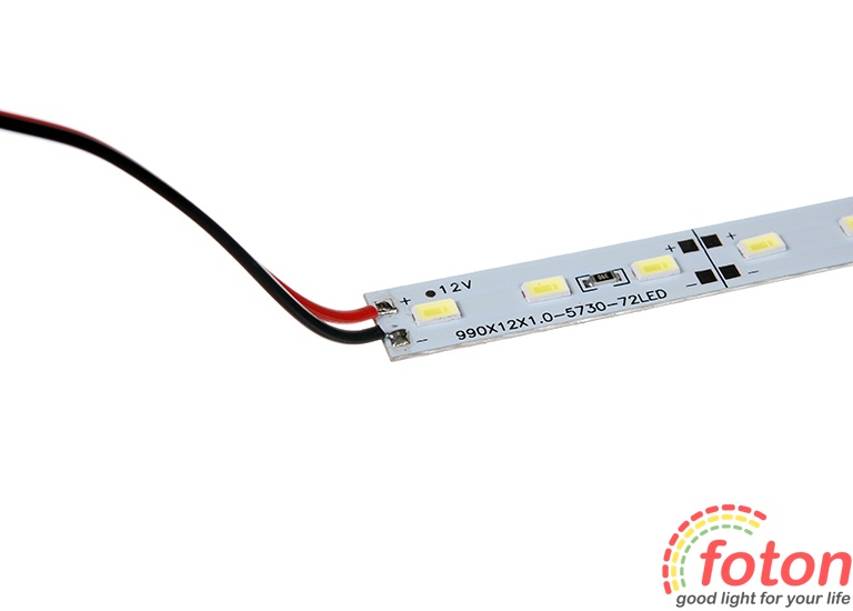 Світлодіодна лінійка на жорсткій алюмінієвій основі. На лінійці встановлено світлодіоди, 72 шт. Робоча напруга 12В.Багато світлодіодів, встановлених на малій відстані один від одного, забезпечують рівномірне освітлення без засвітів і тіней. Термін служби лінійки – понад 30 000 годин. Споживана потужність становить лише 18Вт, що дозволяє заощаджувати кошти на електроенергії.