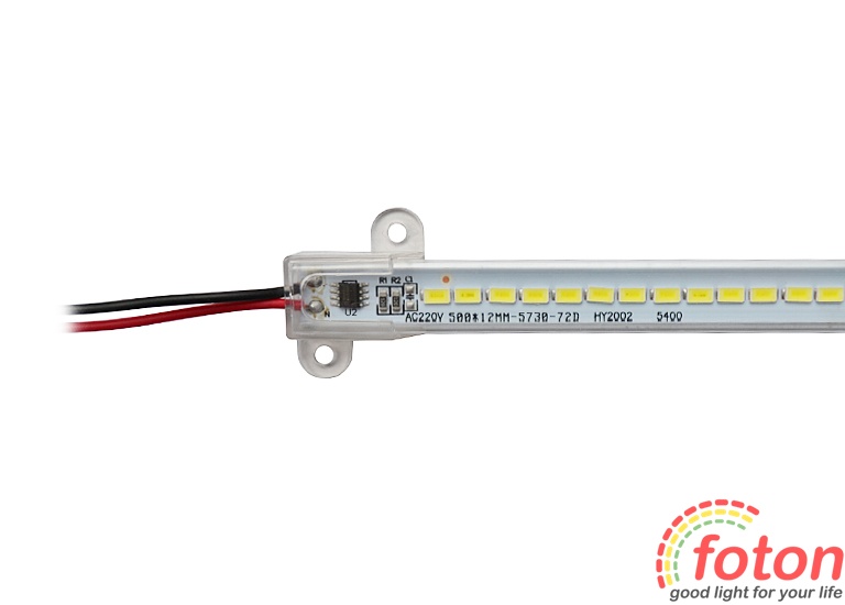 Світлодіодна лінійка SMD 5730, 72LED, 220V IP44 на жорсткій алюмінієвій основі в пластиковому пиловологозахисному корпусі. На лінійці встановлено 72 світлодіоди типу SMD5730. Робоча напруга 220В.