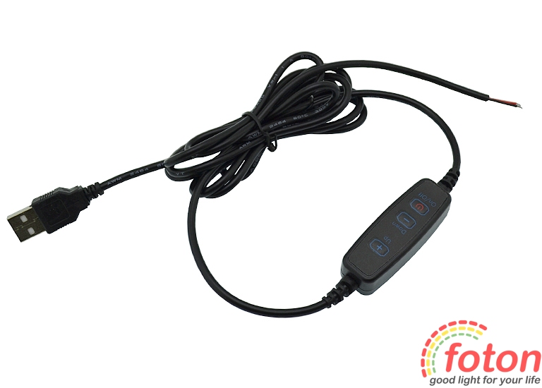 Кабель живлення USB з регулюванням яскравості використовується для керування світлодіодних модулів. Живлення здійснюється через USB роз'єм. Робоча напруга 5 вольт. Робочий струм 2А. Підключення може здійснюватися через адаптер живлення USB або будь-яке інше портативне джерело живлення.