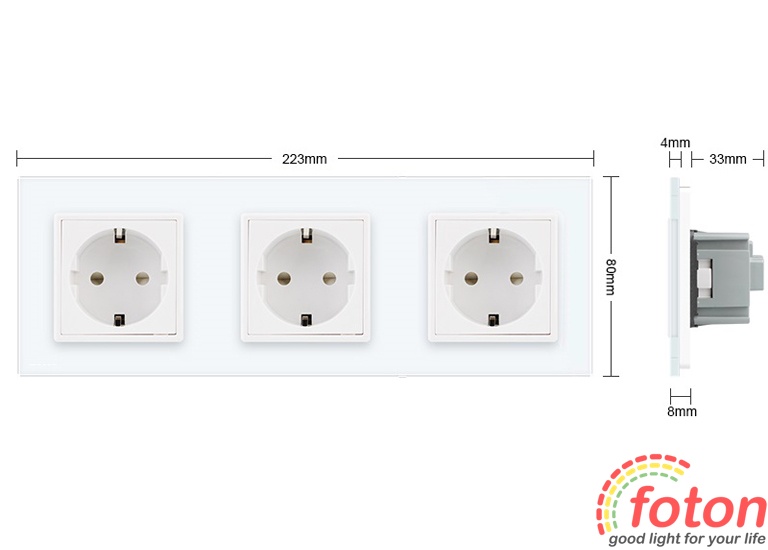Розетка Livolo Glass представляє лінійку якісних розеток із максимальним захистом. Розетка має три гніздові роз'єми для вилки європейського стандарту. Передня панель виконана з розжареного скла, яке забезпечує гладку поверхню, що не дряпається.