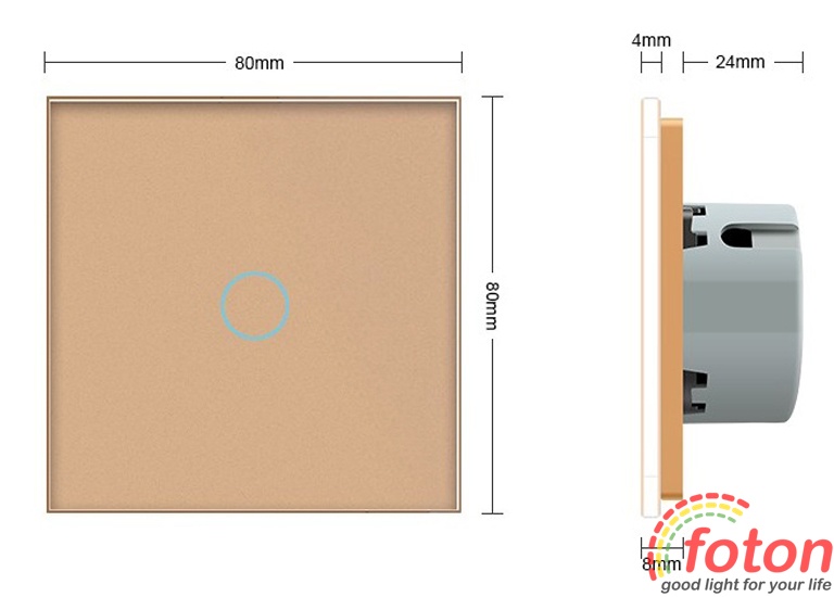 Це один сенсорний вимикач розрахований для керування однієї лінії навантаження до 1000Вт. У процесі використання сенсорними вимикачами відчувається велика різниця в порівнянні з клавішними вимикачами. Вони мають близько 100 000 циклів роботи, зовнішній вигляд залишається колишнім довгі роки, легким дотиком виконується включення, що не порівняно з настирливим клацанням.