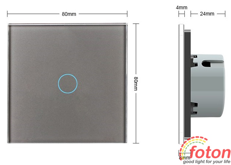 Це один сенсорний вимикач розрахований для керування однієї лінії навантаження до 1000Вт. У процесі використання сенсорними вимикачами відчувається велика різниця в порівнянні з клавішними вимикачами. Вони мають близько 100 000 циклів роботи, зовнішній вигляд залишається колишнім довгі роки, легким дотиком виконується включення, що не порівняно з настирливим клацанням.