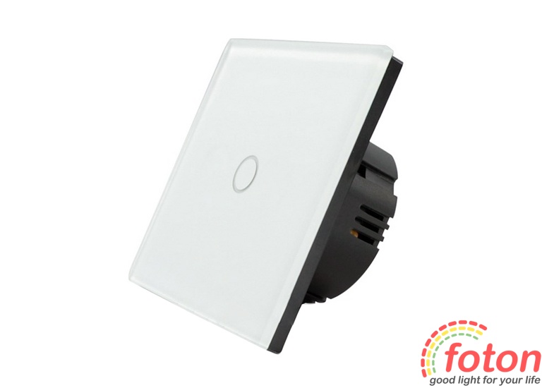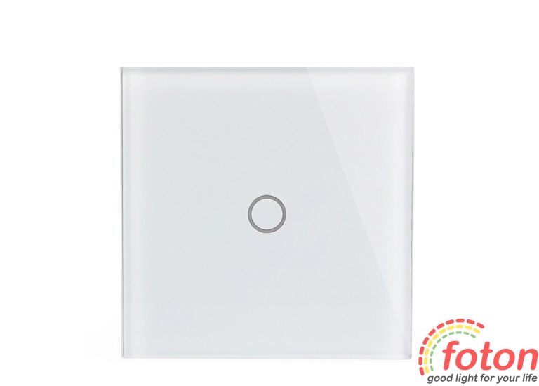 Сенсорний одноклавішний вимикач світла із кристалічного скла. Вимикач працює з усіма типами ламп: розжарювання, енергозберігаючими, галогенними, світлодіодними. При включенні світла кругла піктограма трохи підсвічується синім кольором і лунає характерний звук увімкнення.